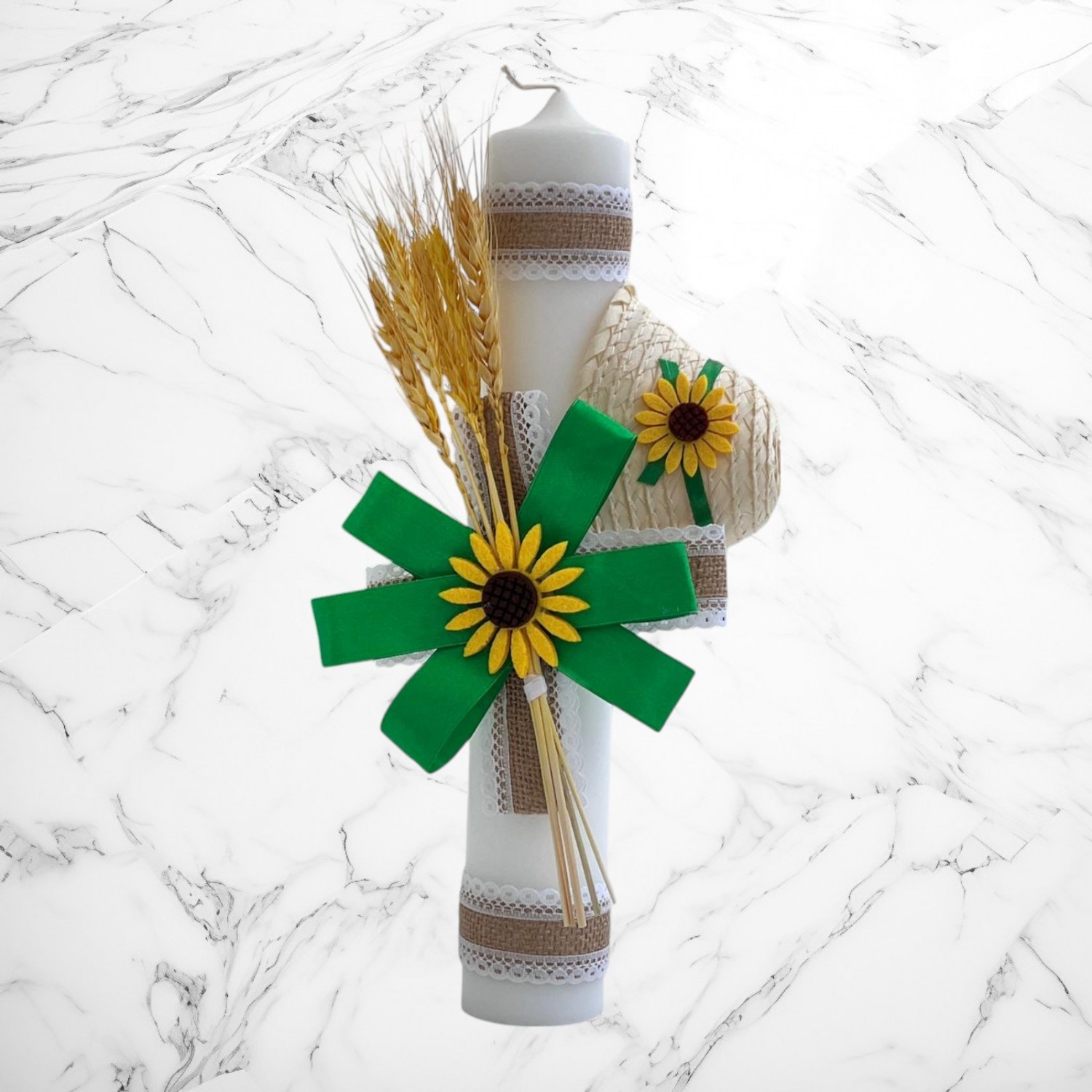 Lumanare botez decor traditional verde cu spice, clop si floarea-soarelui