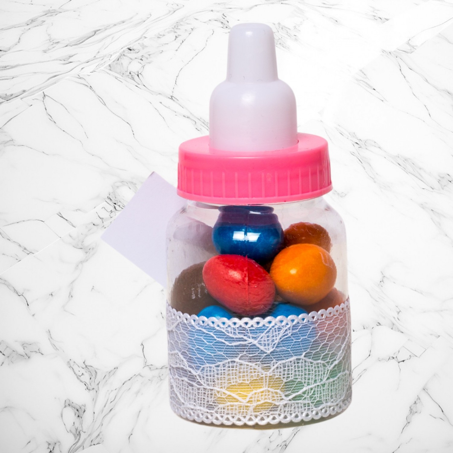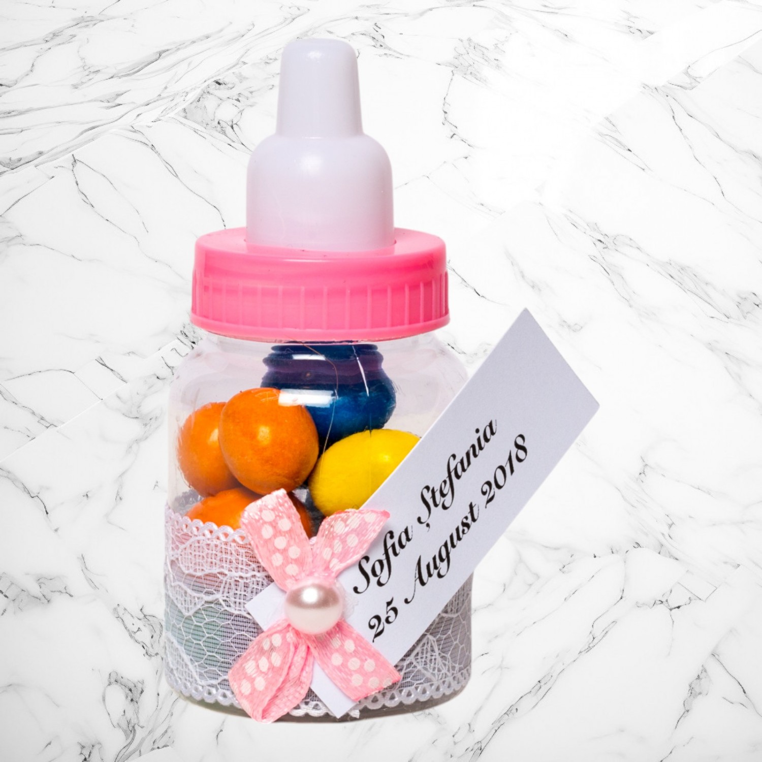 Comanda acum produsul "Marturii botez biberoane cu dantela alba si fundita roz cu buline".