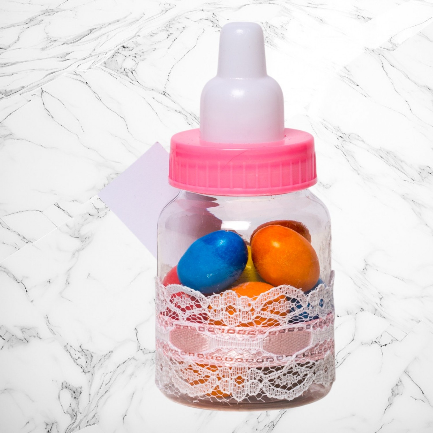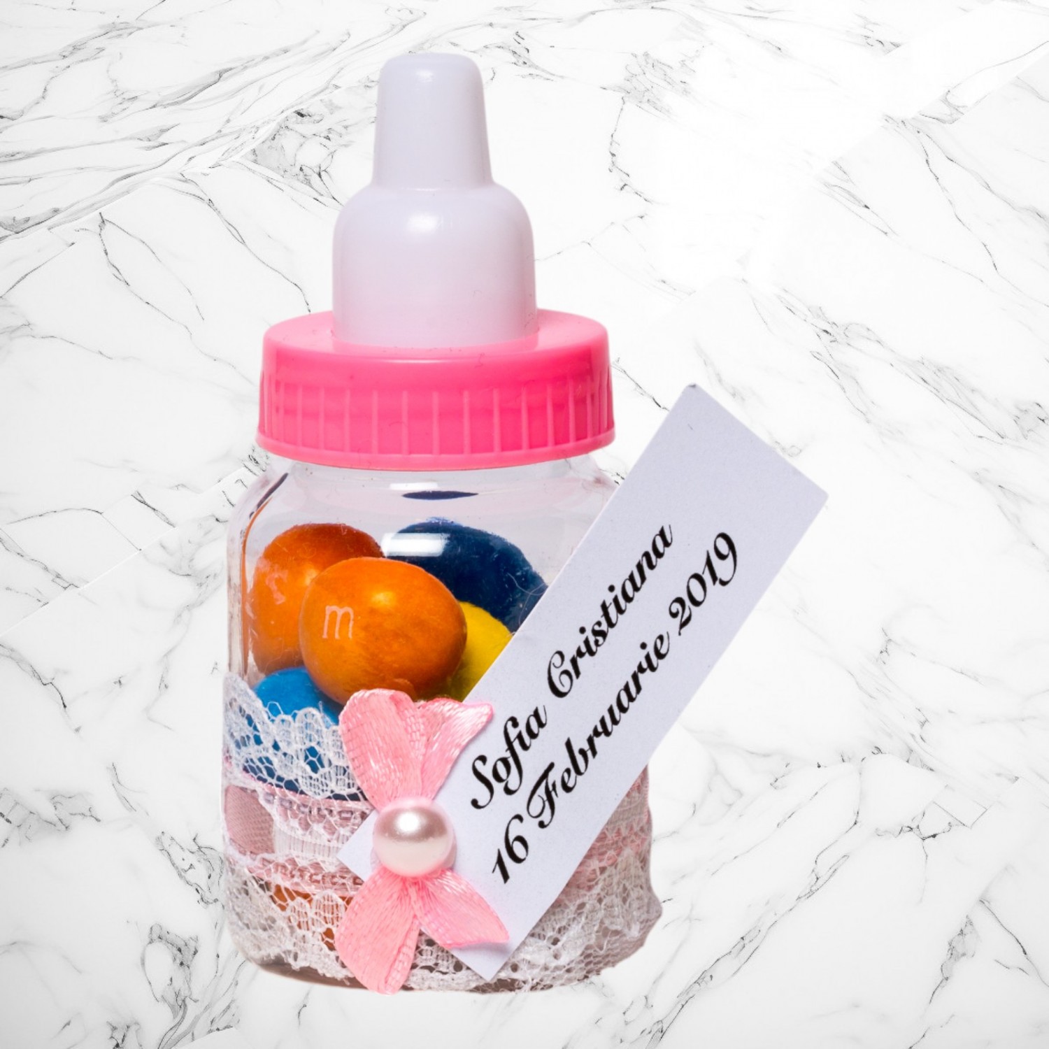 Comanda acum produsul "Marturii botez biberoane roz dantela alba si fundita roz".