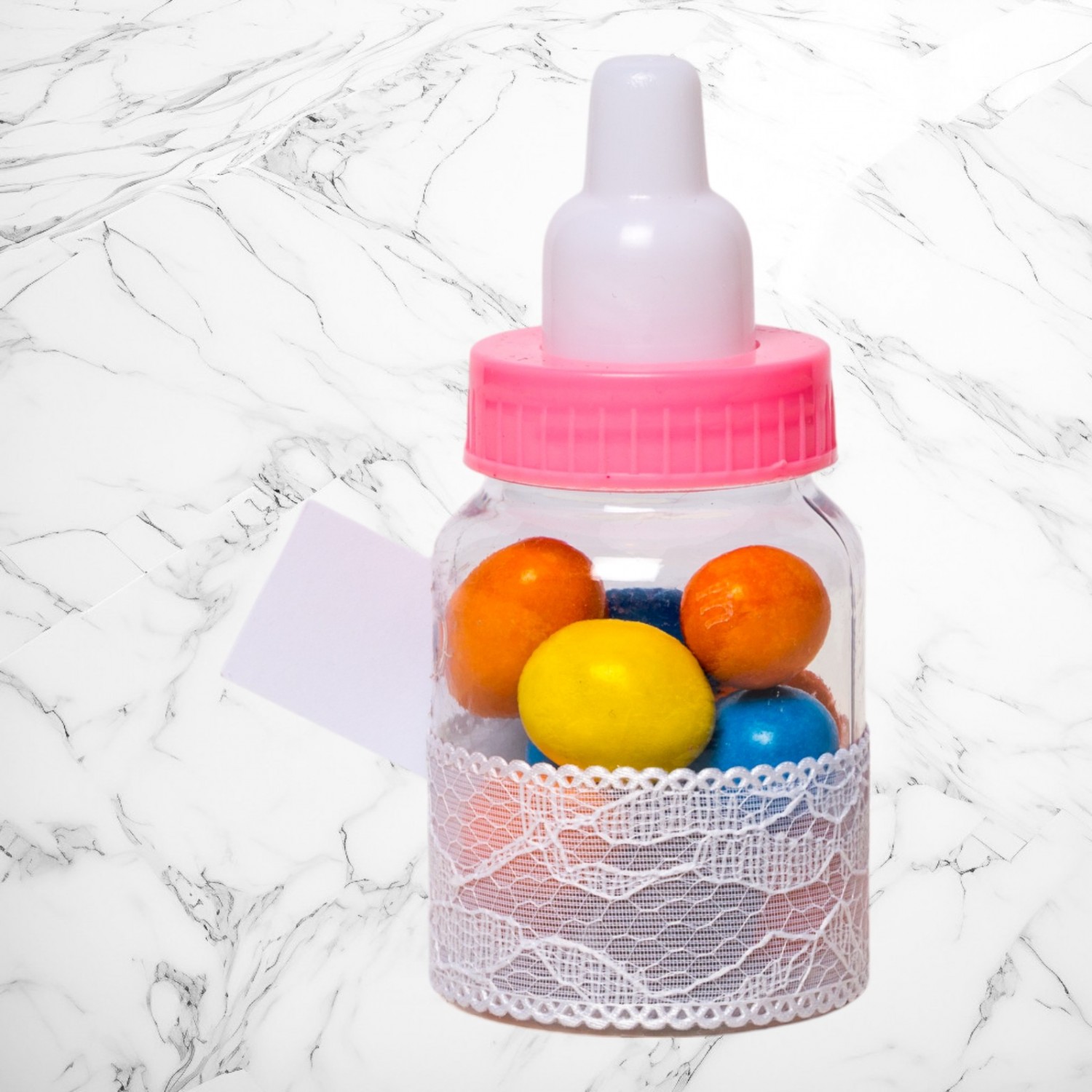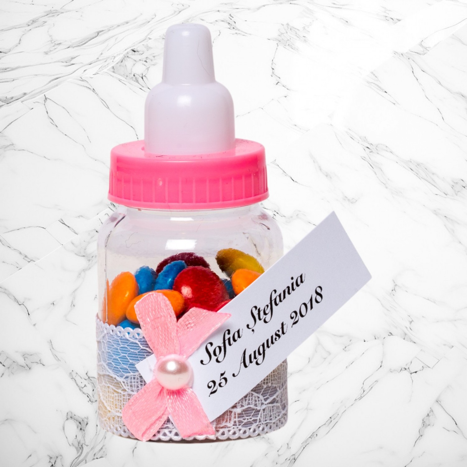 Comanda acum produsul "Martutii botez biberoane roz dantela alba si fundita roz".
