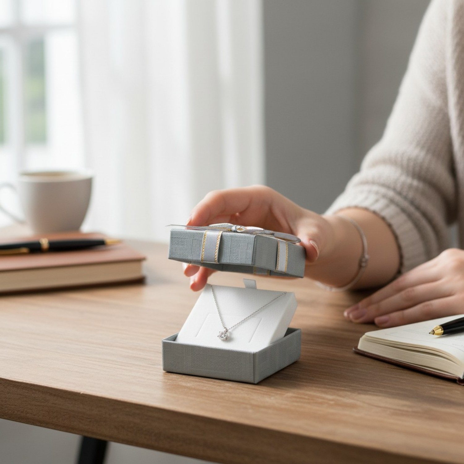 Ofera unei persoane deosebite din viata ta un inel, un pandantiv sau o pereche de cercei intr-o cutiuta cadou de culoare cu fundita argintie.