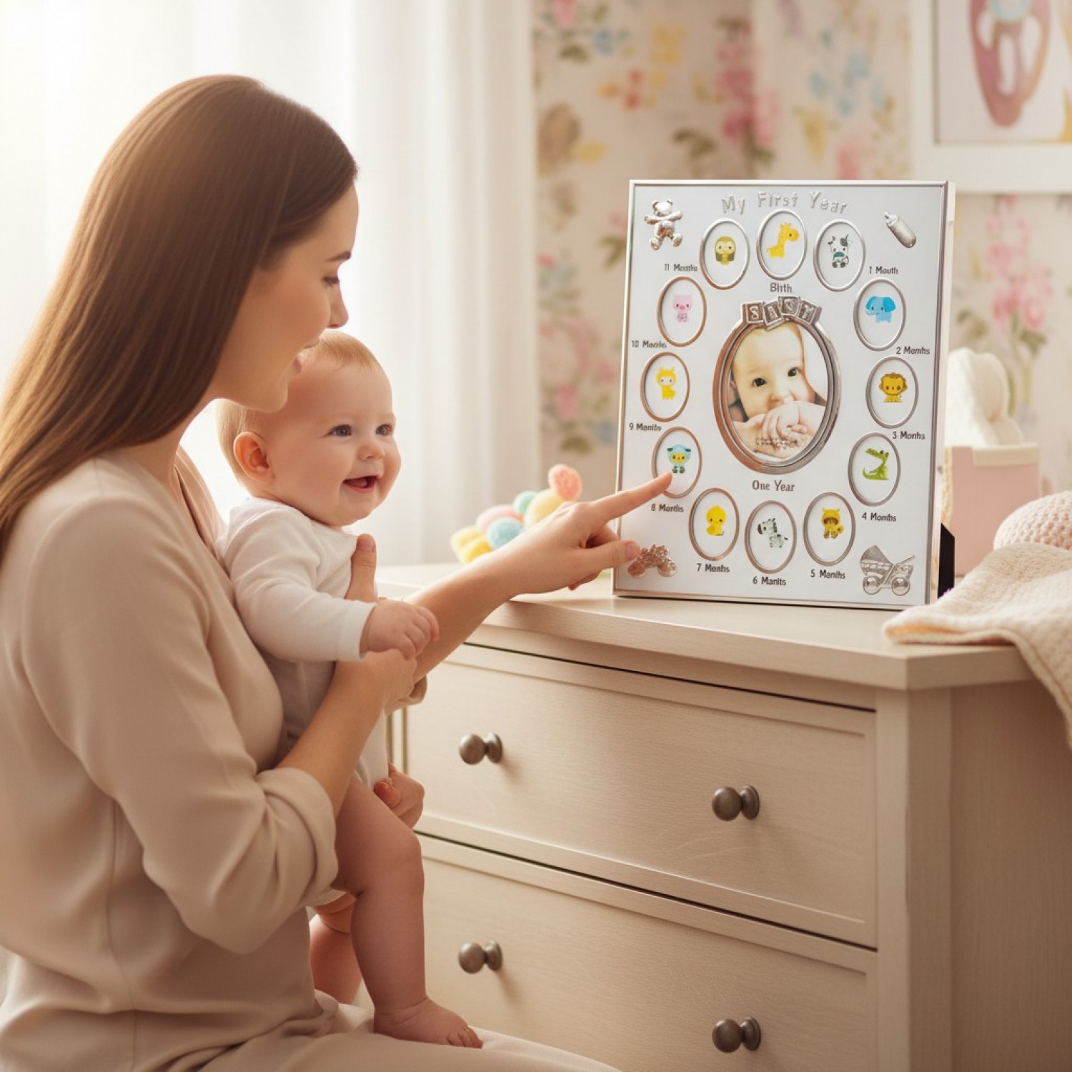 Aceasta rama foto poate fi folosita de parintii unui bebelus pentru a marca prin intermediul a 12 fotografii sugestive fiecare luna din viata bebelusului.