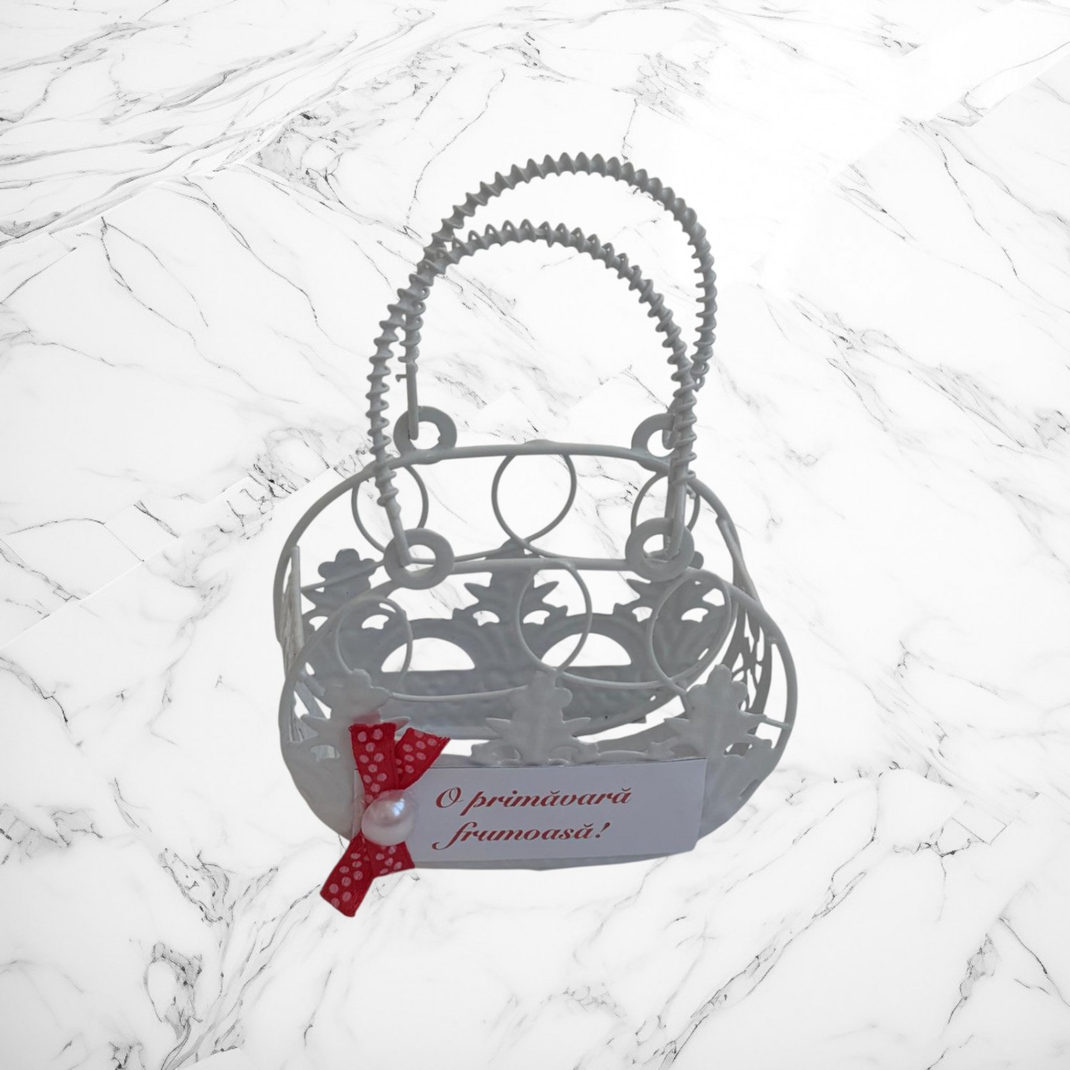 Mărțișor decorativ în formă de gentuță elegantă, realizat din metal tip sârmuliță, cu un design delicat și feminin, inspirat de accesoriile clasice. Este decorat cu o fundiță roșie cu buline, perlă decorativă și mesajul „O primăvară frumoasă!”, care adaugă un accent festiv și simbolic, specific mărțișorului tradițional.