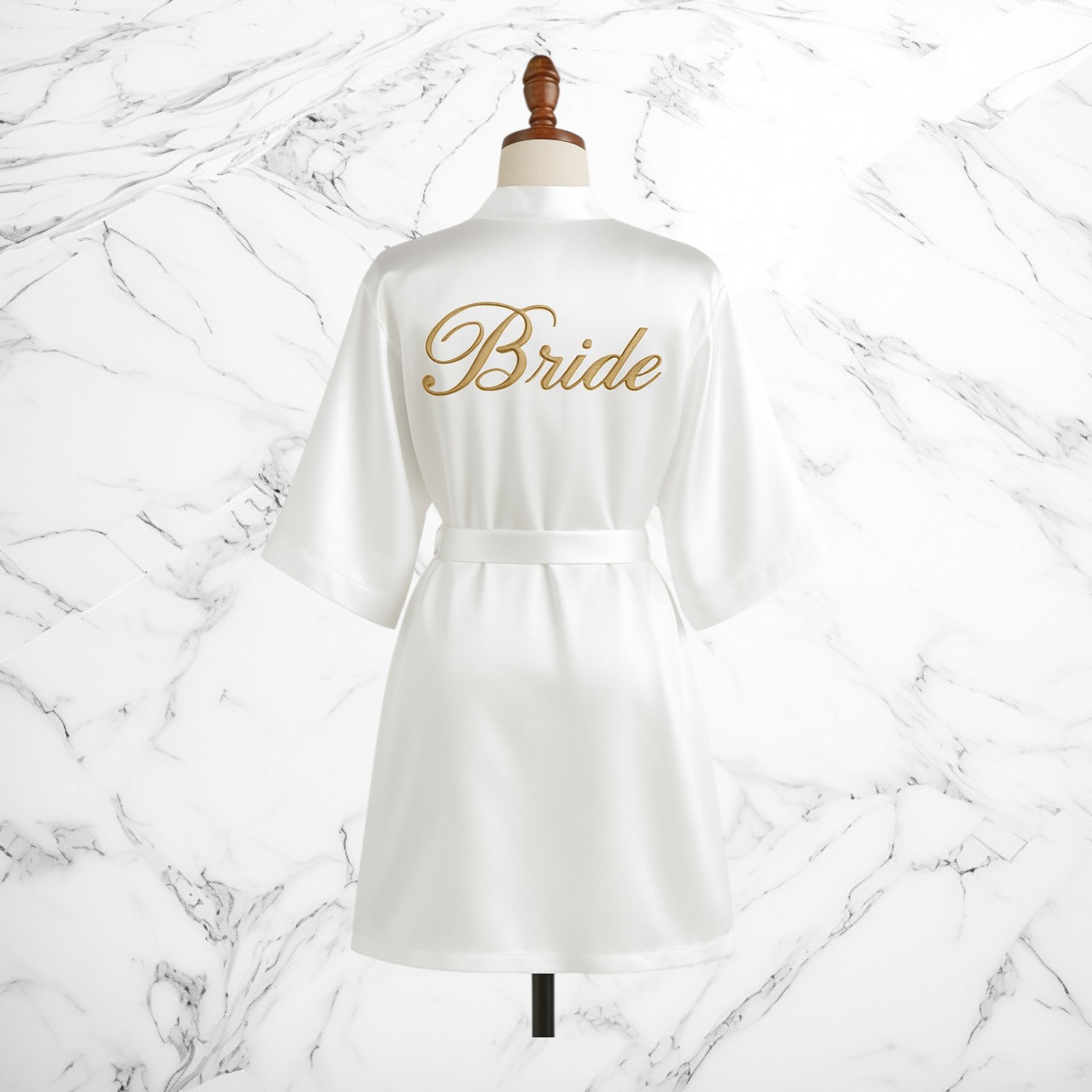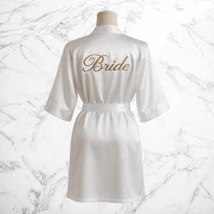 Realizat dintr-un satin fin, cu o textură lucioasă și lejeră, acest halat alb este inscripționat cu „Bride” în nuanță aurie – un detaliu chic care adaugă un plus de farmec și eleganță.