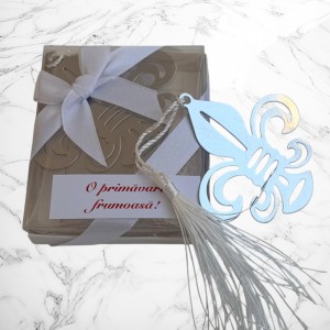 Este accesorizat cu șnur decorativ cu ciucure, fundiță albă și mesajul „O primăvară frumoasă!”, fiind ambalat într-o cutie transparentă, pregătită pentru a fi oferită cadou. Semnul de carte este practic, durabil și potrivit pentru utilizare zilnică.