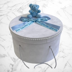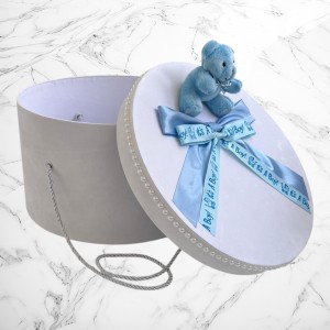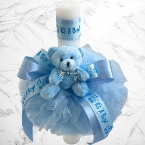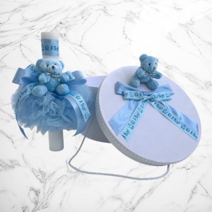 Comanda acum produsul "Set botez bleu it s a boy cu ursuleț – Cutie pentru hăinuțe și lumânare".