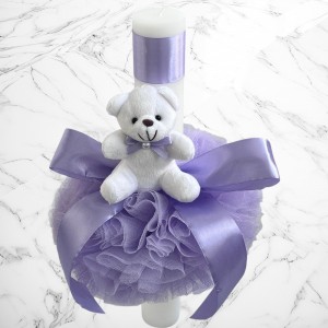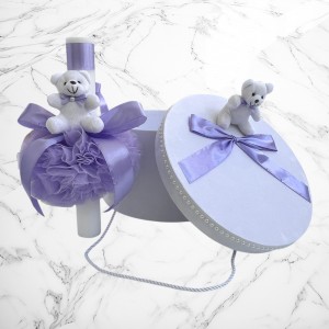 Set botez lila cu ursuleț – Cutie pentru hăinuțe și lumânare