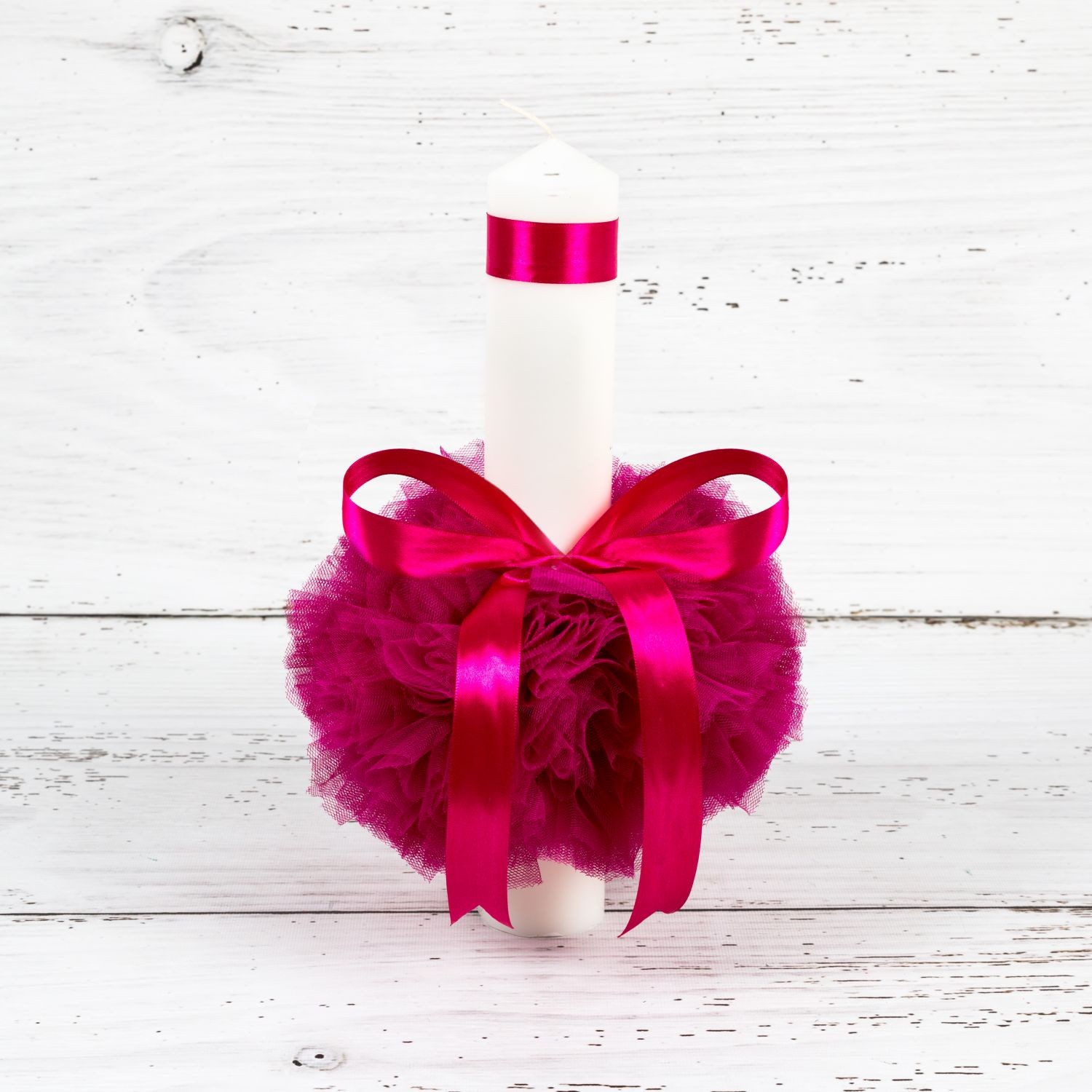 Lumanarea cu tulle roz fucsia are inaltimea de 35 cm si diametrul 5,5 cm. Aceasta este realizata din ceara alba.