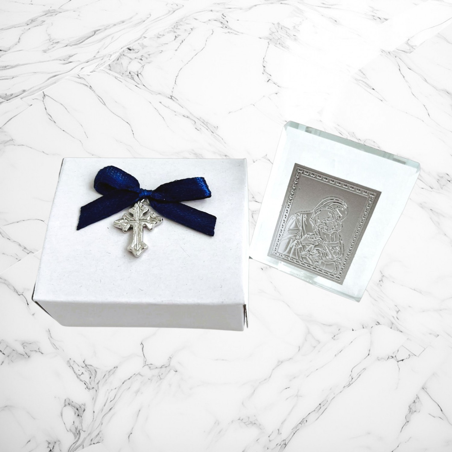 Comanda acum produsul "Set botez lumânare și trusou Cu drag de la nași - bebeluș bleumarin".