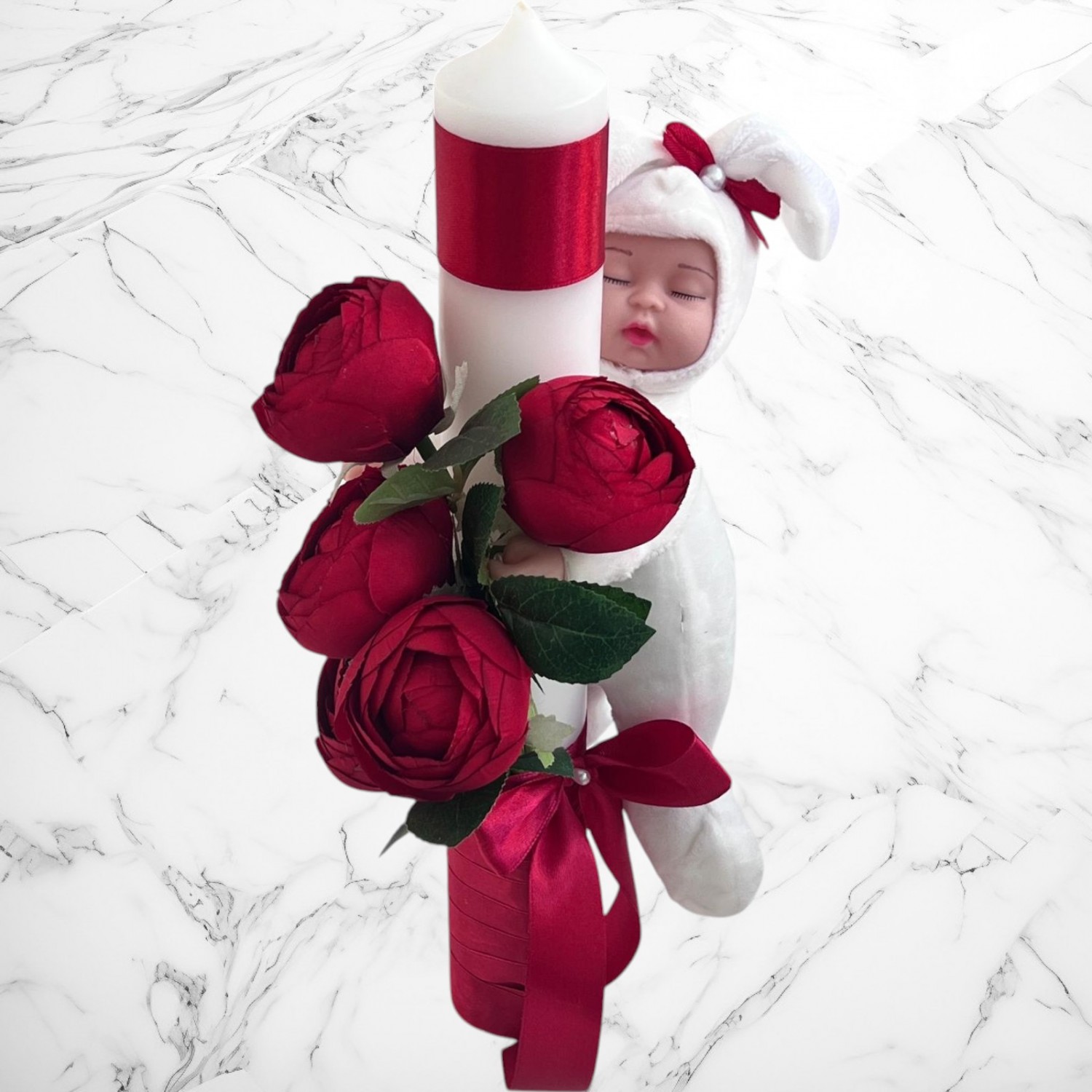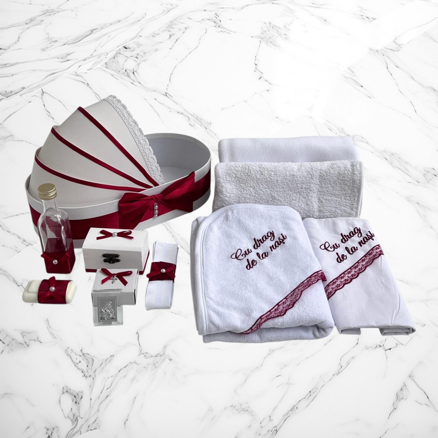 Set botez Lumânare, Trusou, Cutie hainuțe bujor Cu drag de la nași – grena