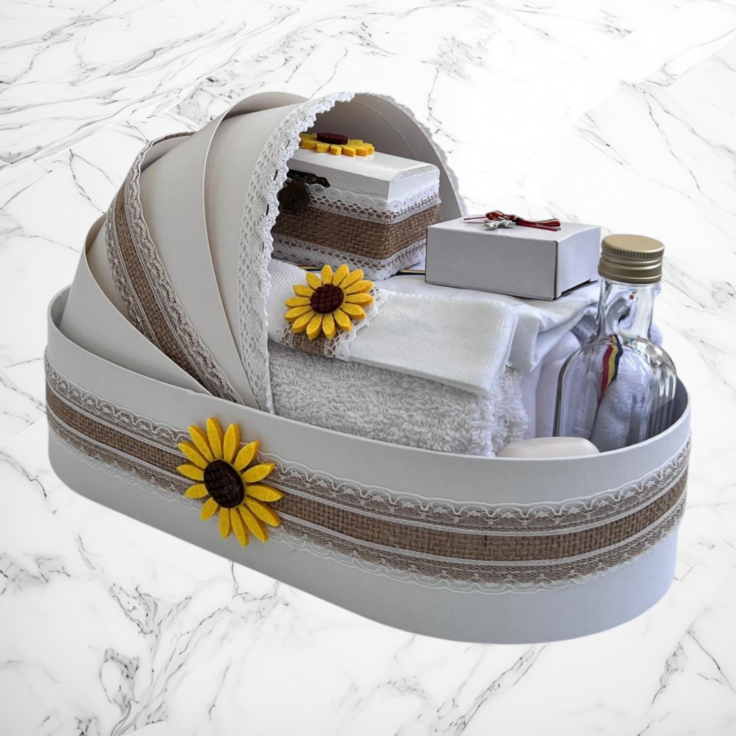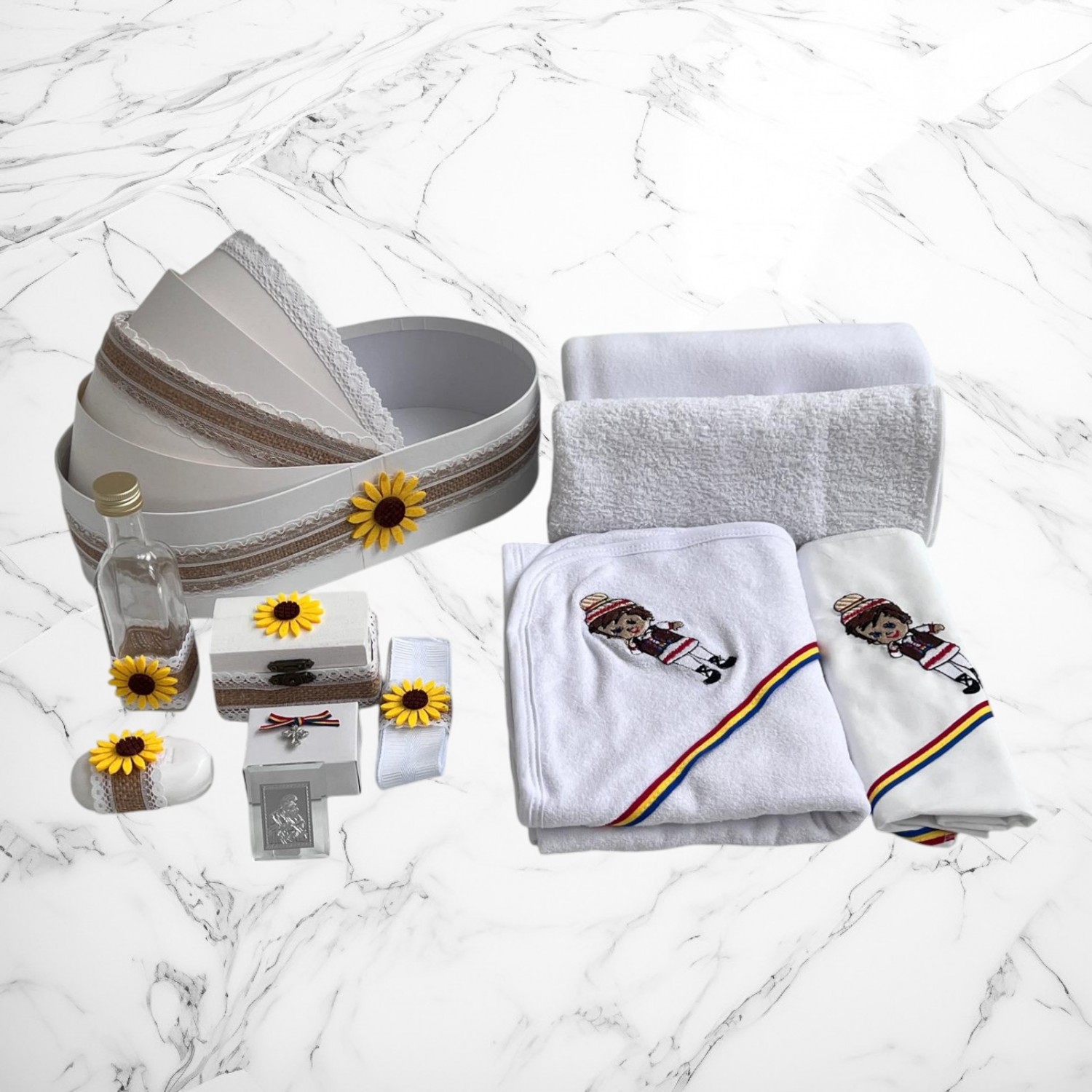 📦 Ambalaj: Toate elementele trusoului sunt așezate într-o cutie albă din carton, în formă de landou, decorată cu fundă și perlute