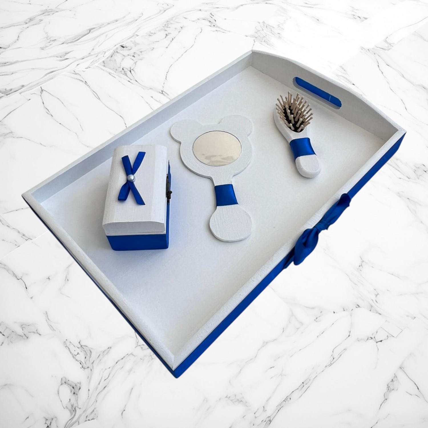 Acesta este un set pentru tăierea moțului, realizat într-o tematică elegantă alb-albastru. Setul include:
