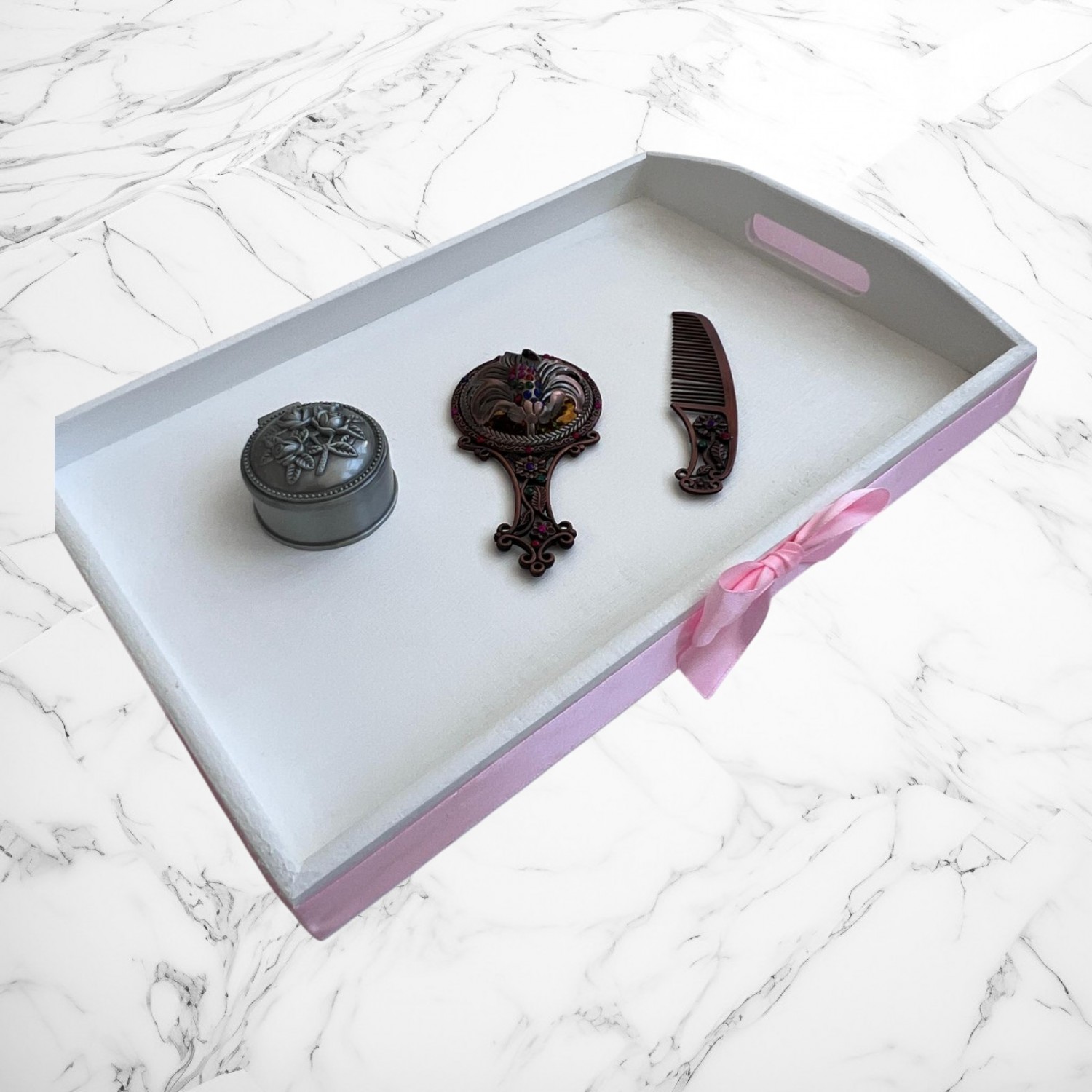 Tăviță decorativă din lemn, vopsită în alb cu accente roz (inclusiv o fundiță laterală) – ideală pentru prezentarea obiectelor într-un mod festiv.